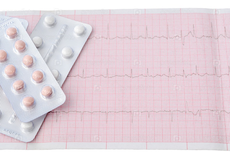 Таблетки в блистере на фоне ленты ЭКГ