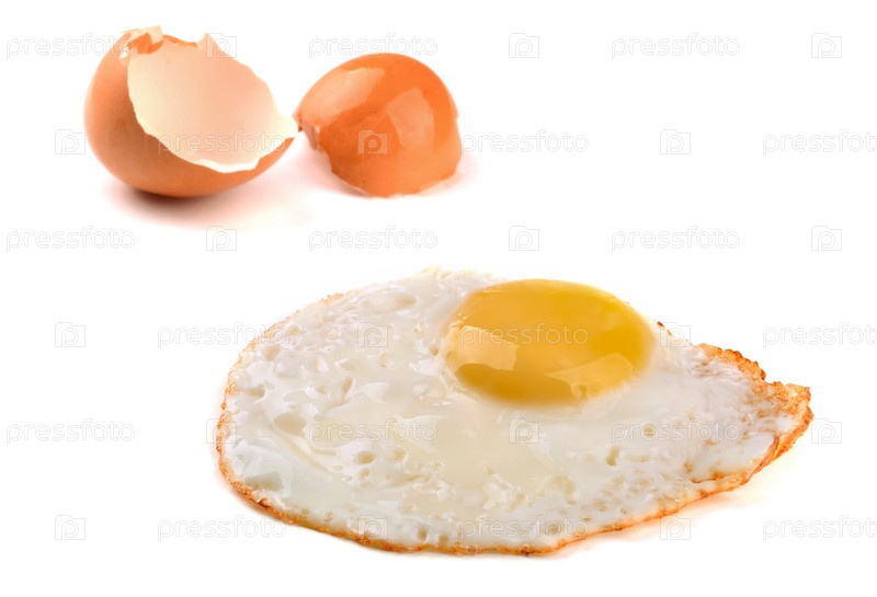 Яичница и яичная скорлупа на белом фоне