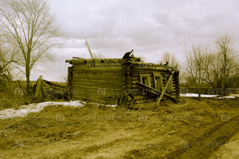 Старинный деревянный дом с обвалившейся крышей