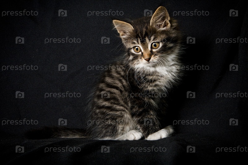 Серый полосатый котенок на черном фоне