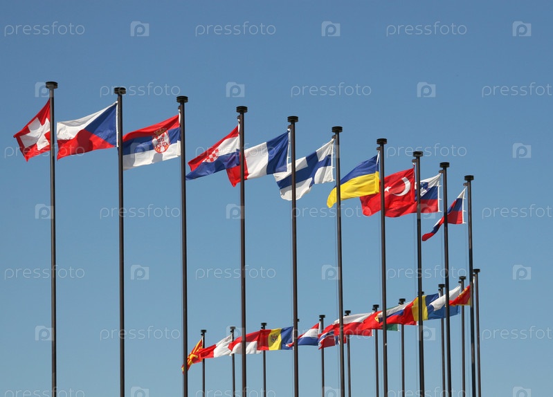 Флаги разных стран, развевающиеся на ветру