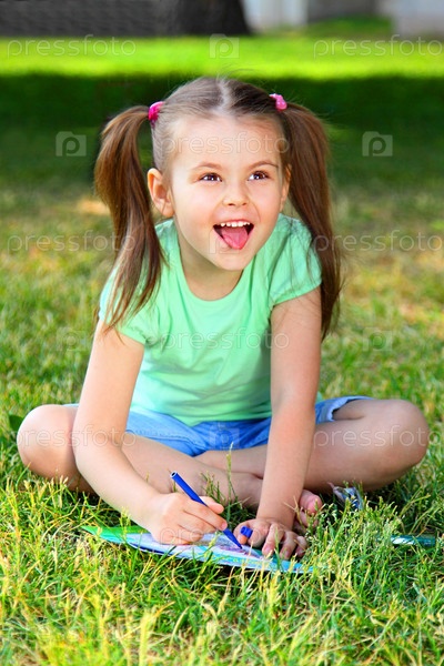 Девочка сидит на траве и рисует