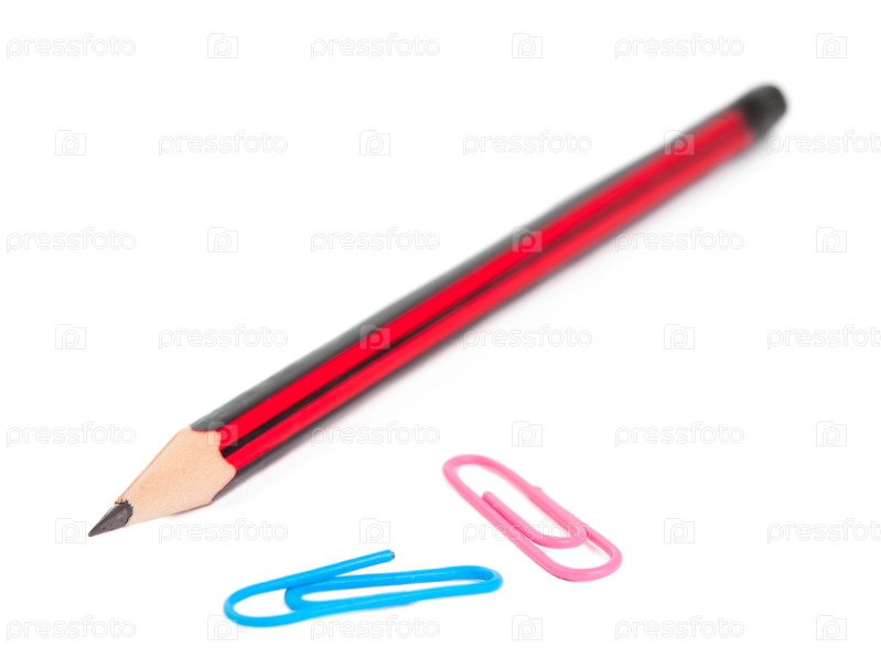 Карандаш и две скрепки на белом фоне