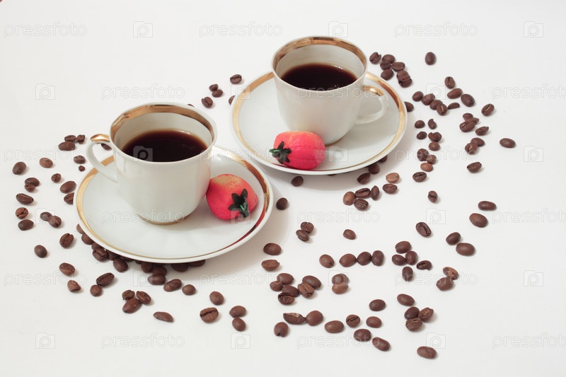 Две чашки кофе и клубника из марципана