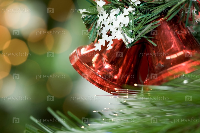 Близкий план красных игрушечных колокольчиков, висящих на зеленой ветке елены, украшенной бумажной снежинкой