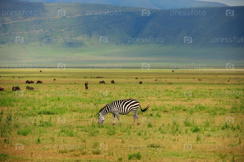 Зебра пасется на траве на фоне гор. В далеке пасутся другие копытные животные