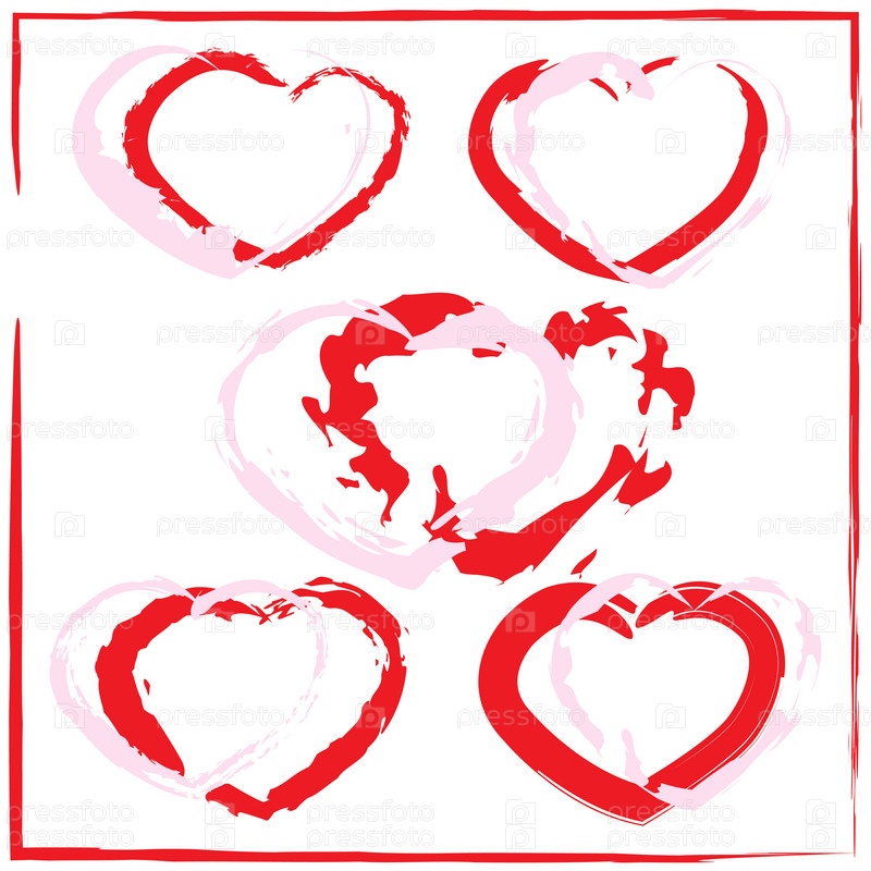 Пять красных абстрактных сердечек в красной рамке. Изолированные на белом фоне
