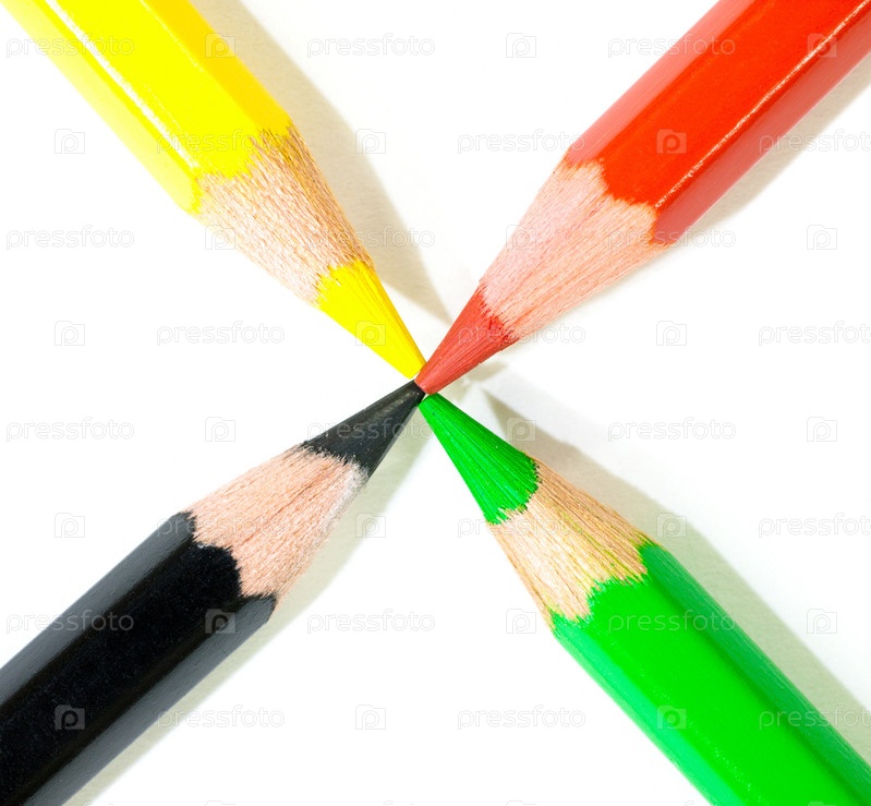 Красный, желтый, зеленый и черный карандаши на белом фоне. Стержнями сходятся в одной точке
