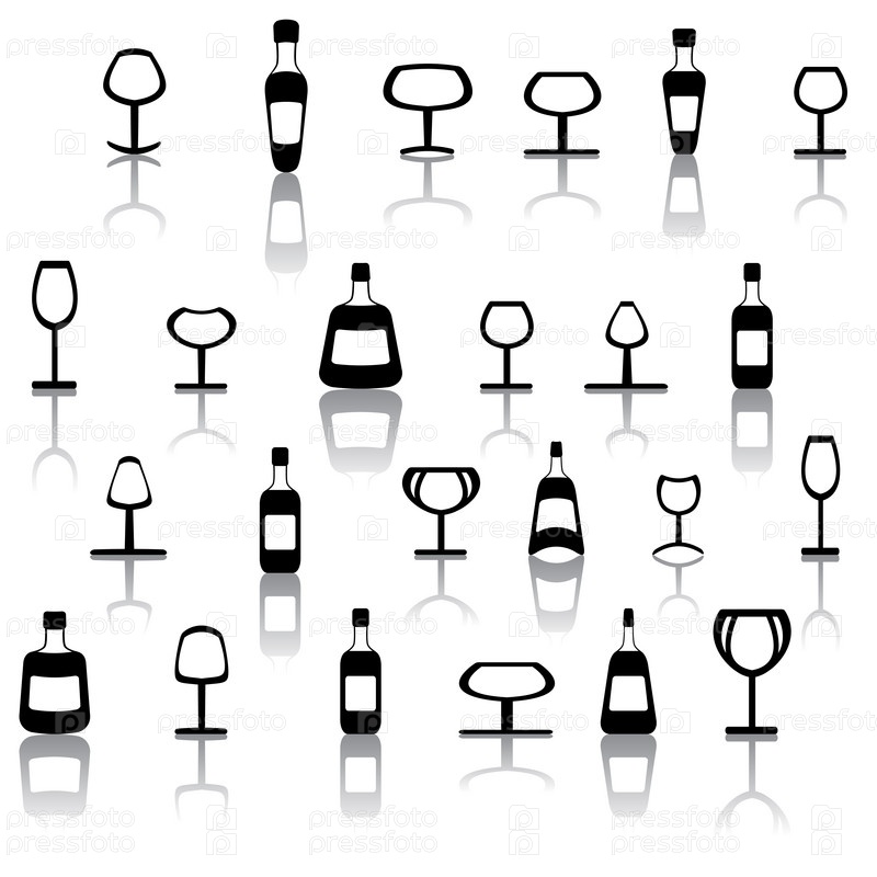 Набор векторных пиктограмм бокалов и бутылок с алкоголем