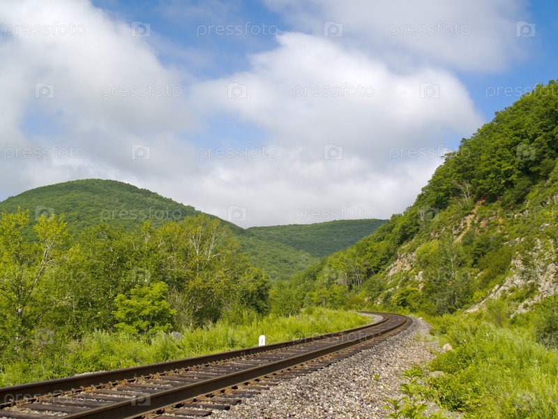 Железная дорога, зеленые холмы и облачное небо