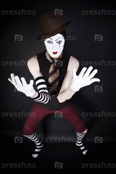 Мим в шляпе, галстуке и белых перчатках на черном фоне