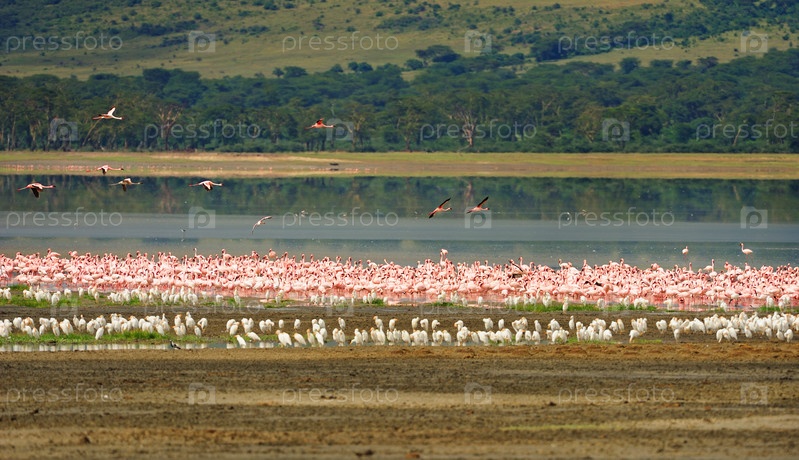Стаи птиц на берегу озера