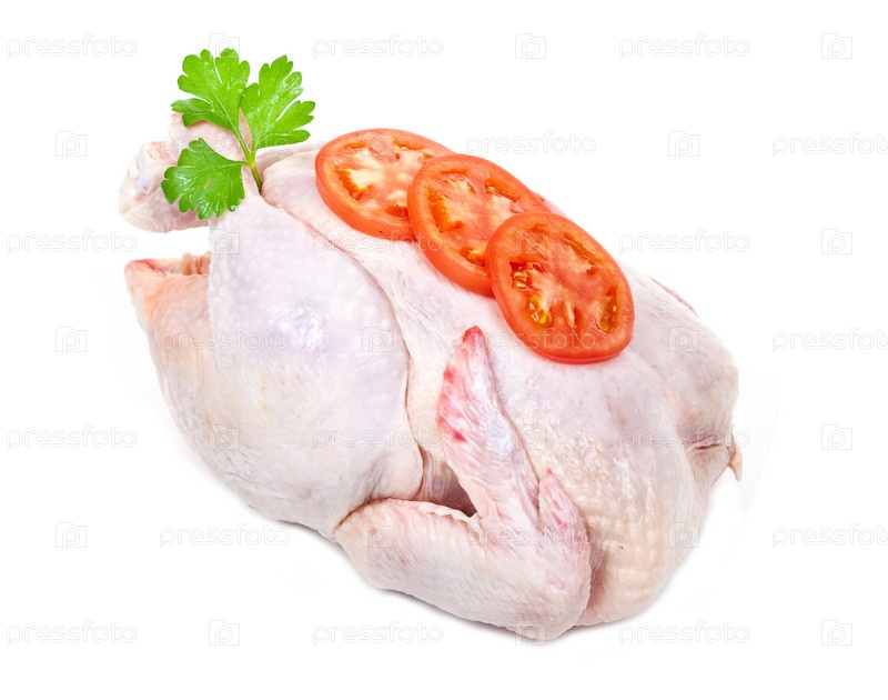 Сырая куриная тушка с зеленью и томатом