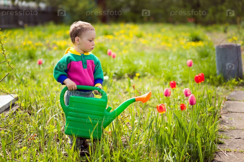 Маленький мальчик поливает цветы