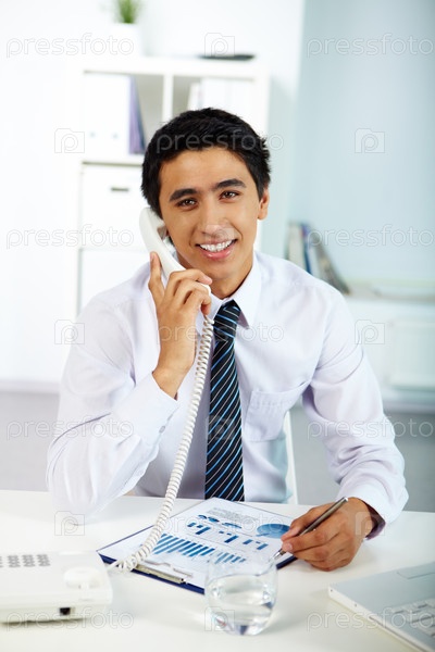 Менеджер сидит в офисе за столом и говорит по телефону
