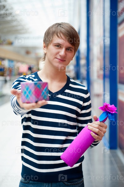 Портрет молодого человека с декоративной бутылкой и маленьким подарком