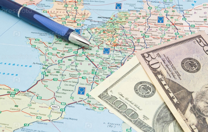 Голубая ручка и деньги на карте Европы