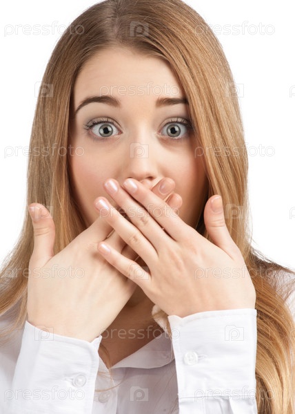Портрет удивленной девушки, прикрывающей рот руками. Крупный план. Белый фон