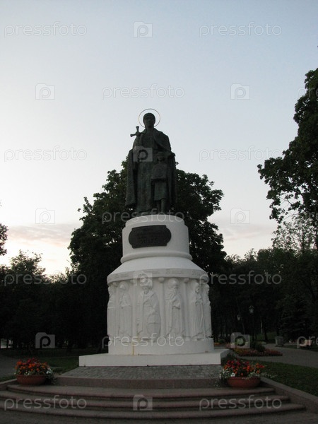 Памятник Святому на белом пъедестале на фоне вечернего неба