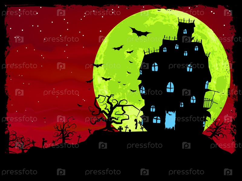 Зловещий плакат 'Хэллоуин' с летучими мышами, полной луной и замком. EPS 8 векторный файл