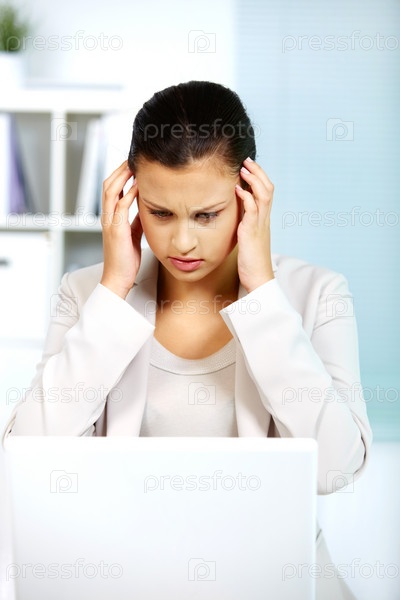 Обеспокоенная офисная сотрудница смотрит в ноутбук