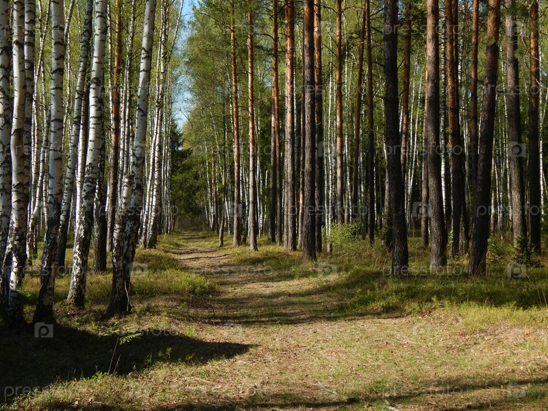 тропинка вдоль сосен и берез