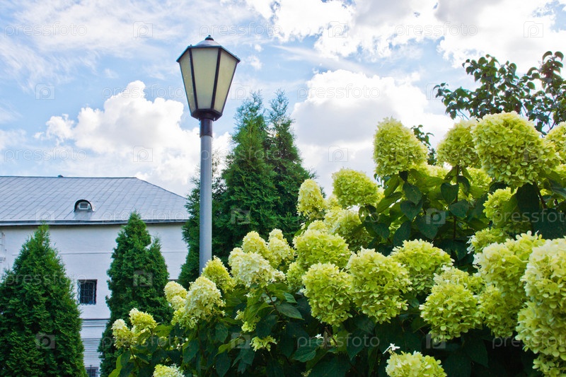 Уличный фонарь среди цветов