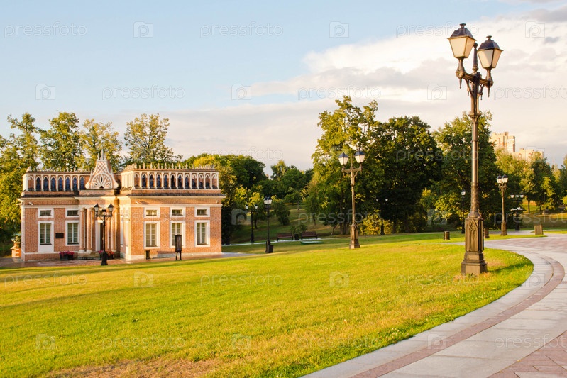 Уличные фонари вдоль тротуара в парке