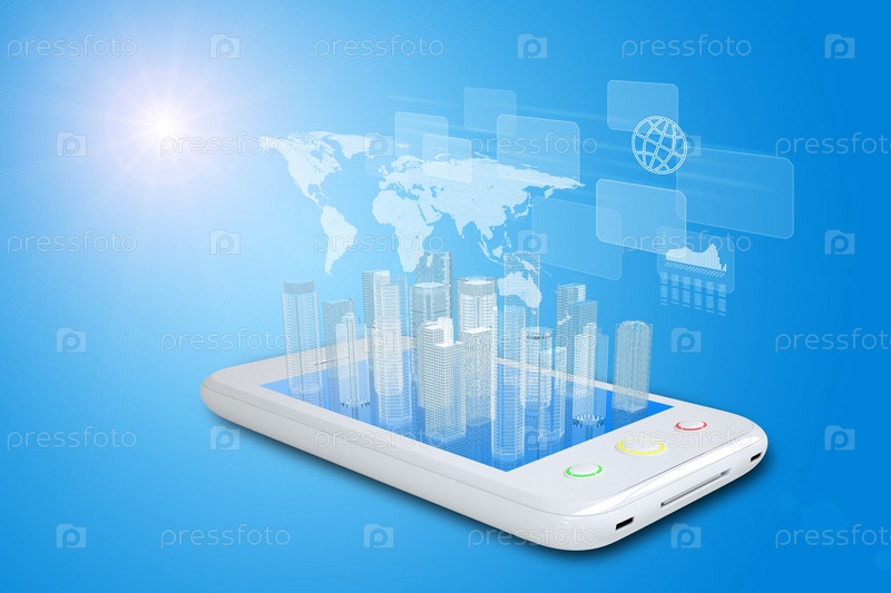 Белый смартфон с виртуальным городом