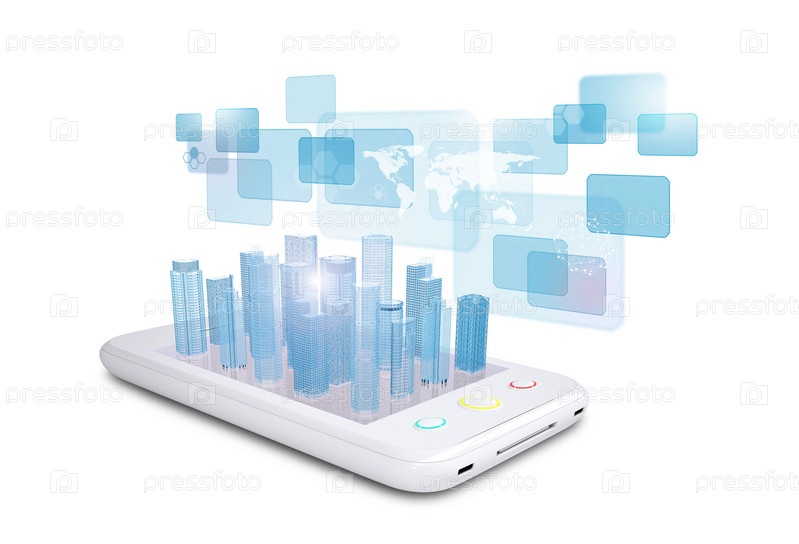 Белый смартфон с виртуальным городом