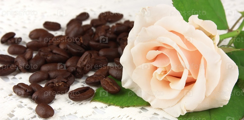 Зерна кофе с белой розой на кружевной ткани