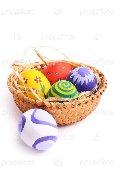 Пасхальные яйца в корзине на белом фоне
