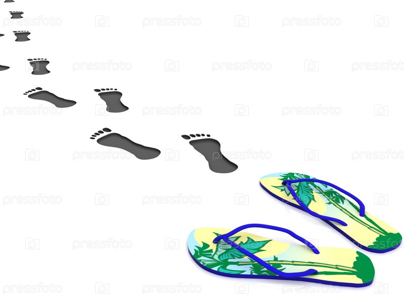 Следы уходящие в даль и женские сланцы на белом фоне