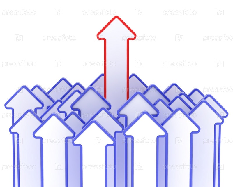 Группа синих стрелок, смотрящих вверх. В цетре красная стрелка выше всех. Белый фон