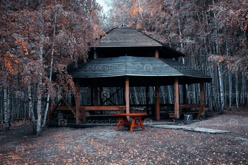 Деревянная беседка в березовой роще. Осень