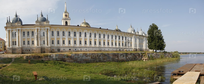 Дворец на лужайке на берегу водоема