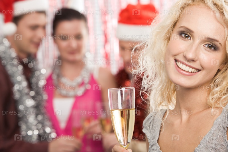 Портрет красивой женщины с шампанским, глядящей в камеру и улыбающейся