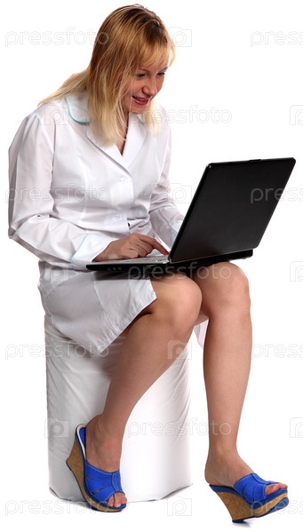 Женщина-врач с ноутбуком на белом фоне