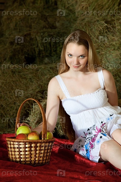 Девушка с яблоками на стоге сена