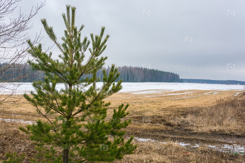 Сосна на фоне желтого поля