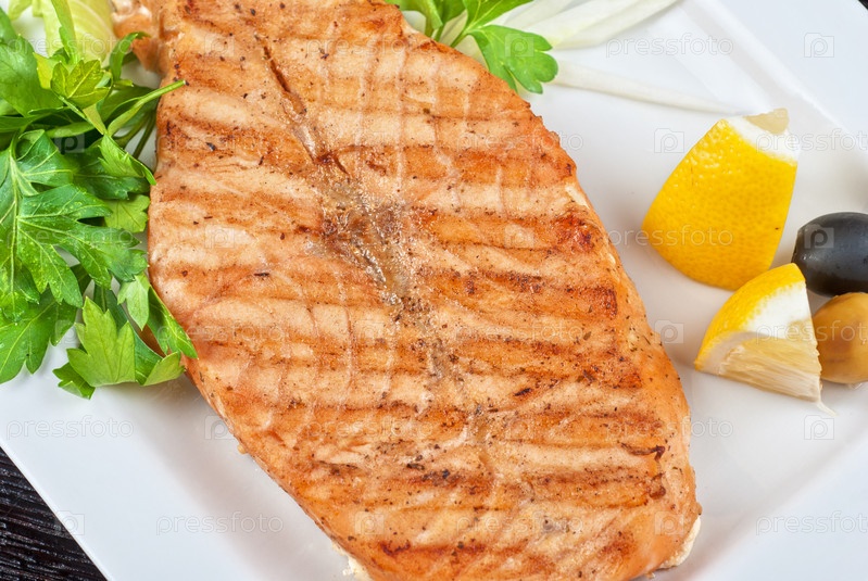 Стейк из лосося с зеленью, лимоном и маслинами на блюде