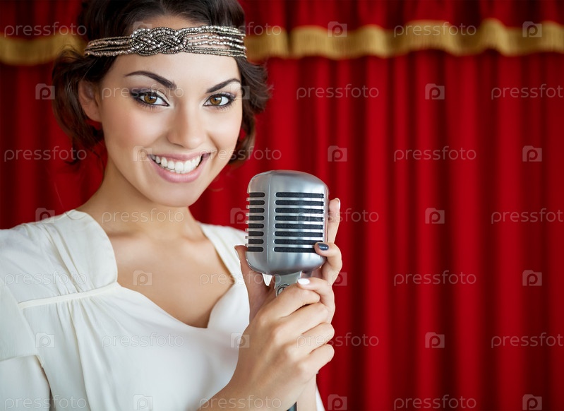 Красивая женщина поет в микрофон