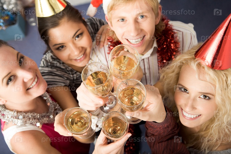 Вид сверху на флейты, полные шампанского, которые держат счастливые друзья на вечеринке по случаю дня рождения