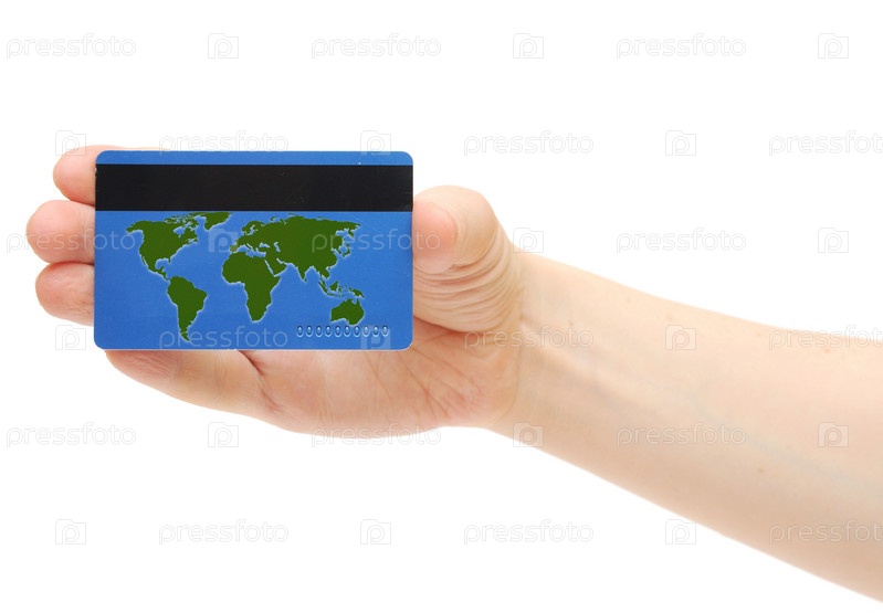 Пустая синяя кредитная карта с картой мира в руке на белом фоне