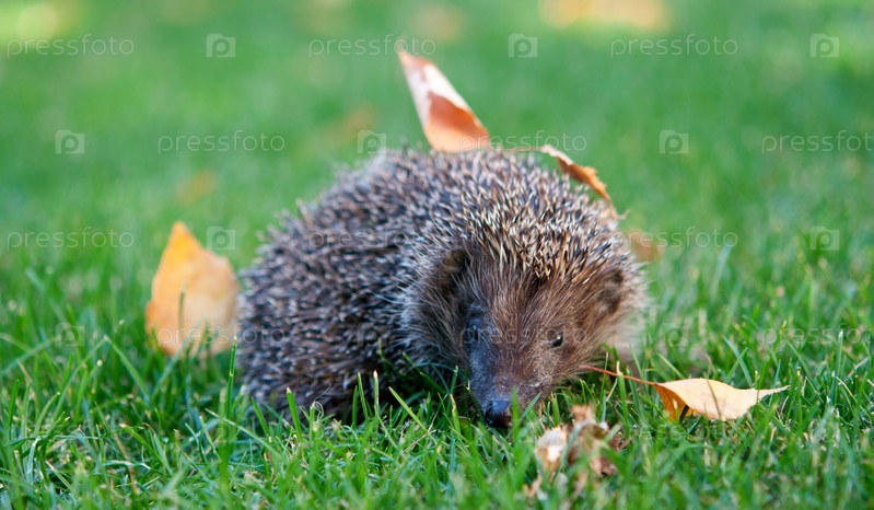 Ежик в траве с осенними листьями. Крупный план