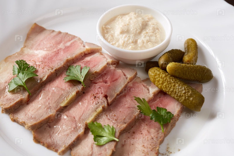 Копченое мясо с соусом и маринованными огурцами