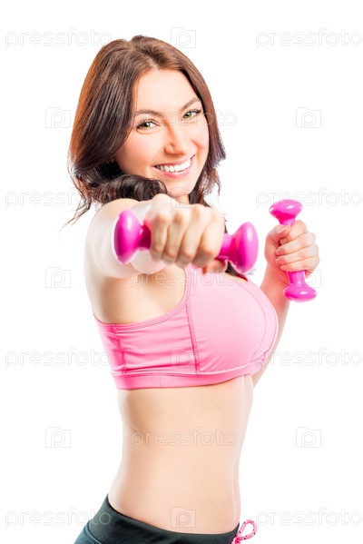 Брюнетка с розовыми гантелями