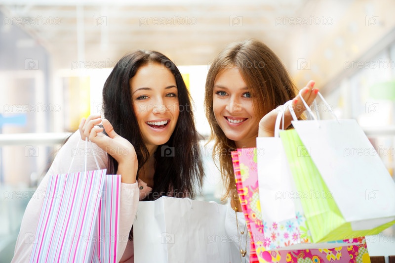 Две девушки с покупками в торговом центре