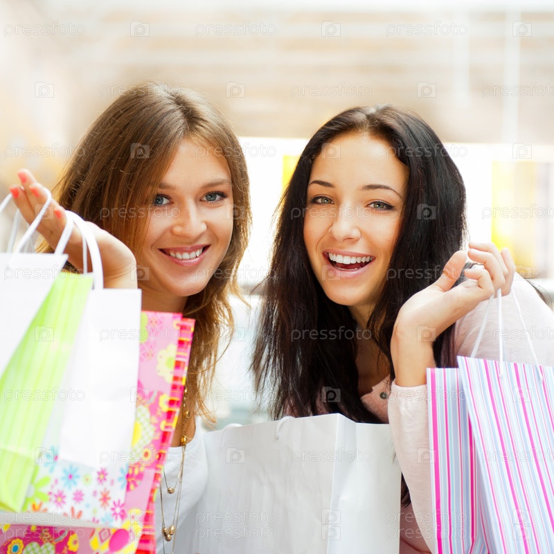 Две девушки с покупками в торговом центре