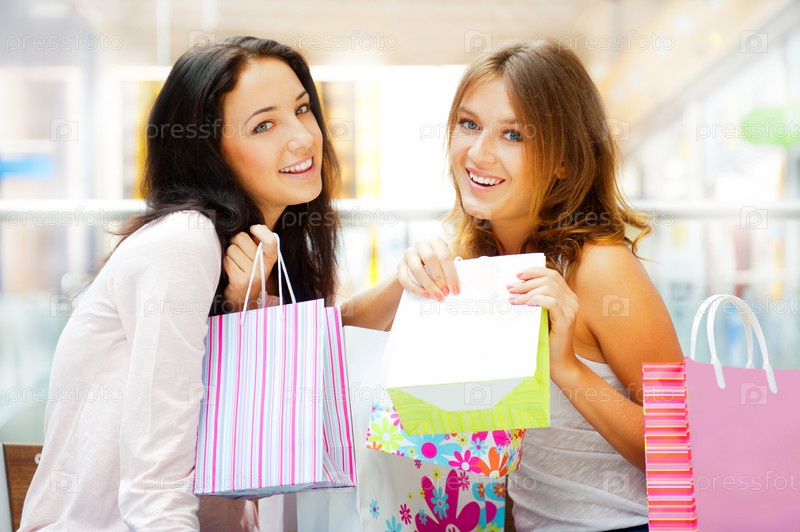 Две девушки с покупками в торговом центре
